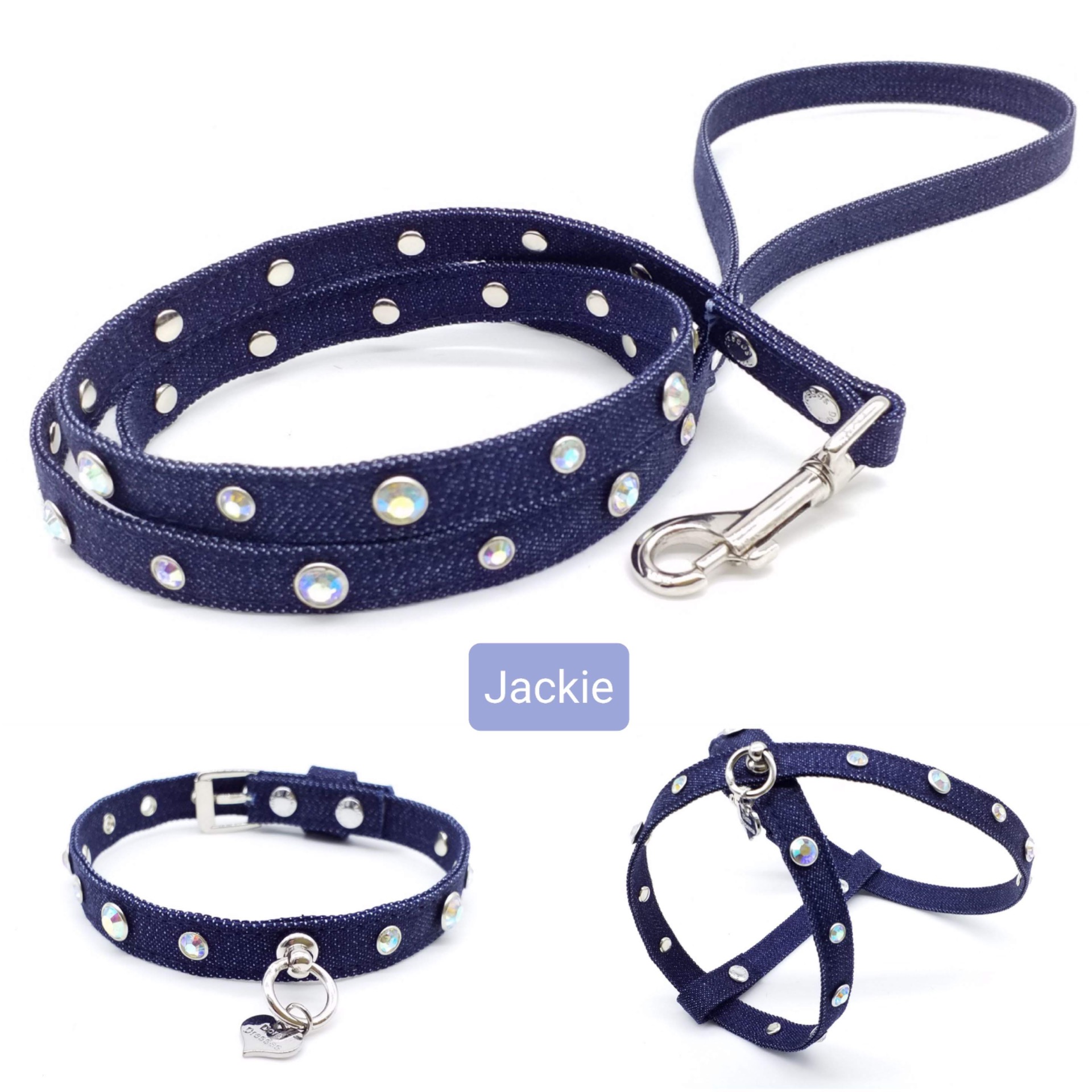 il Collare la pettorina ed il guinzaglio sono realizzati a mano e su richiesta in tessuto Jeans altezza 1,2 cm Ideale per cani di piccola taglia. controlla le disponibilità per effettuare l'ordine. puoi scegliere anche un solo accessorio per il tuo cagnolino. Il guinzaglio è lungo 120 cm e il moschettone e la metalleria sono come in foto.