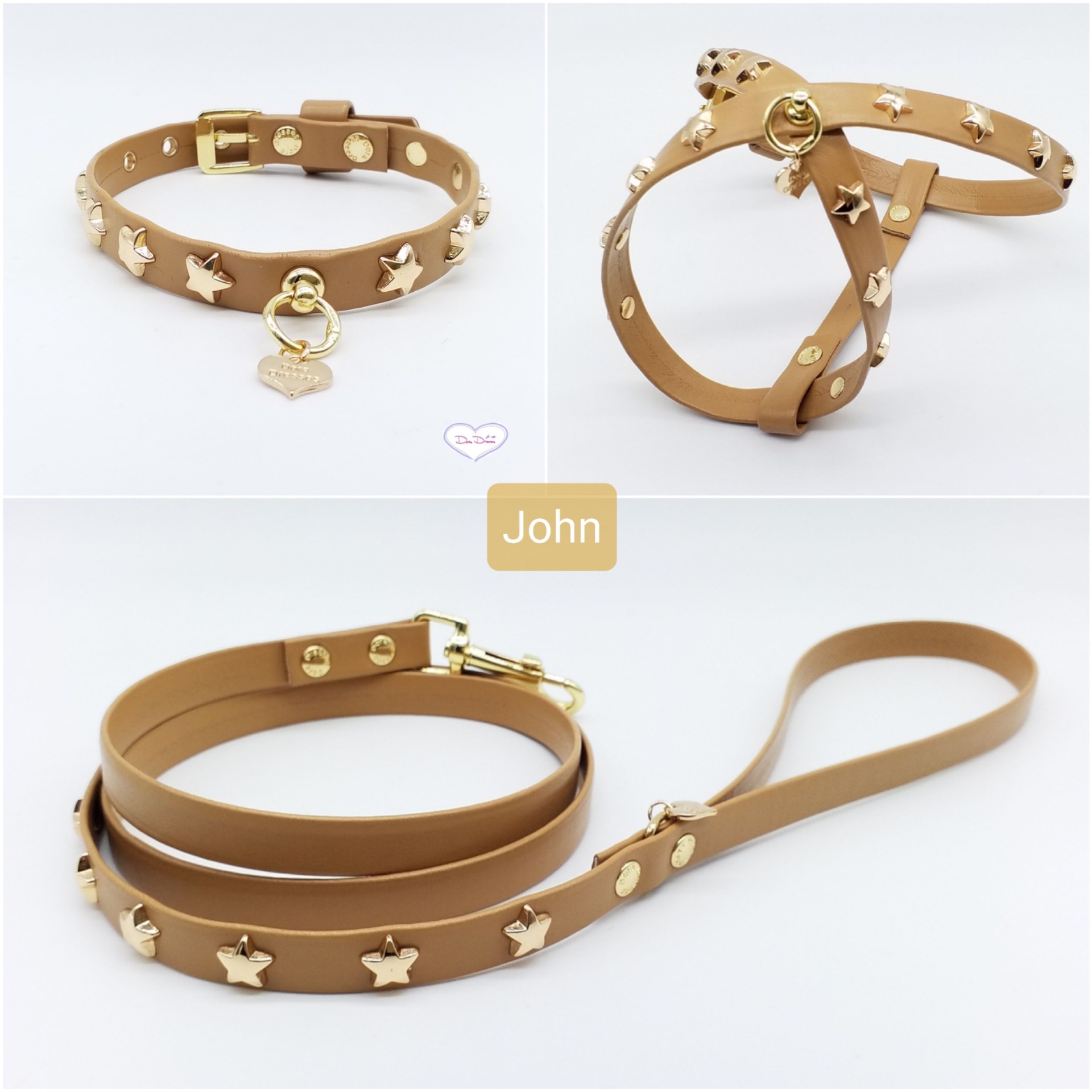 il Collare la pettorina ed il guinzaglio sono realizzati a mano e su richiesta in ecopelle puo' essere realizzato con ecopelle lucida ( verniciato) oppure ecopelle opaco ( satinato) altezza 1,2 cm Ideale per cani di piccola taglia. controlla le disponibilità per effettuare l'ordine. puoi scegliere anche un solo accessorio per il tuo cagnolino. Il guinzaglio è lungo 120 cm e il moschettone e la metalleria sono come in foto