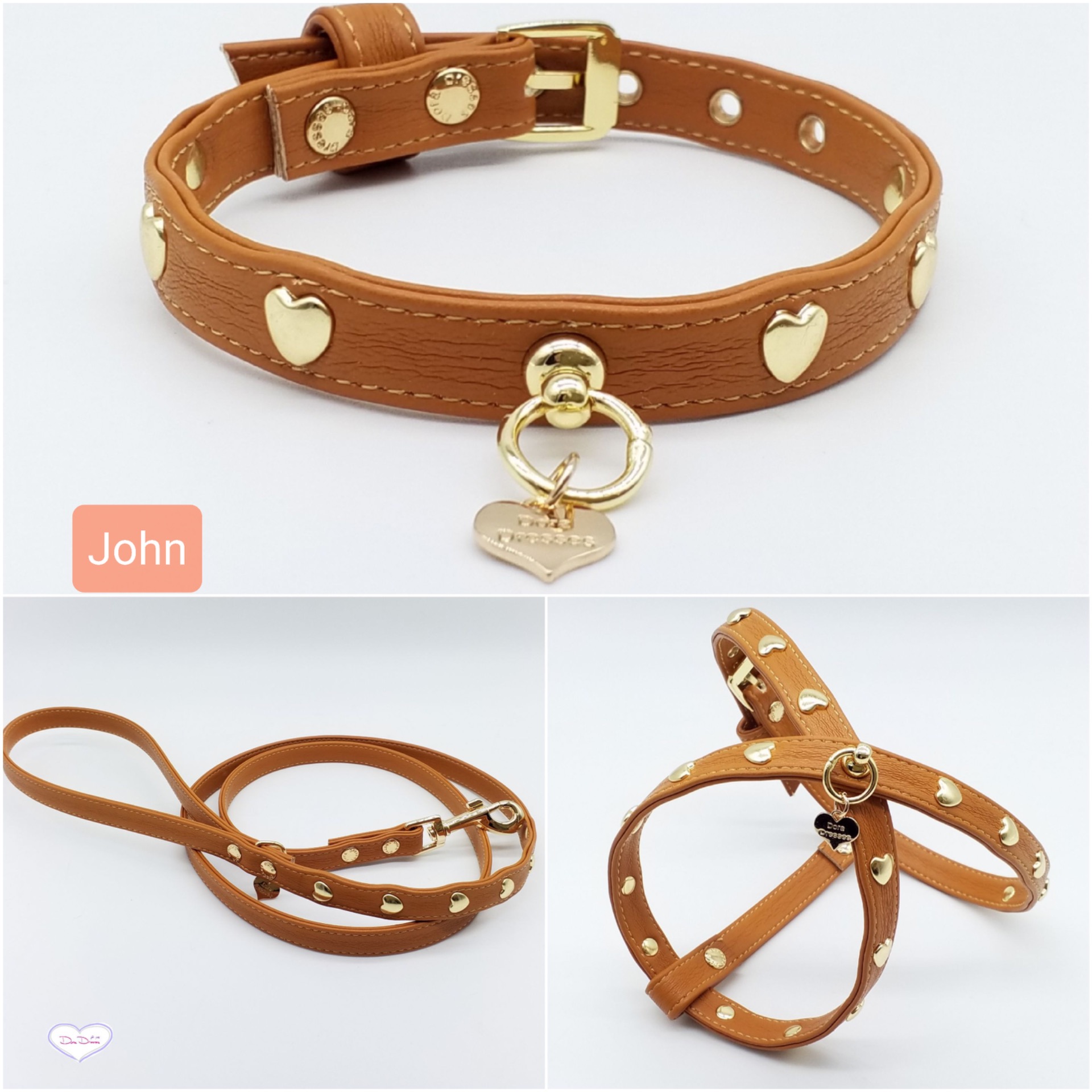 il Collare la pettorina ed il guinzaglio sono realizzati a mano e su richiesta in ecopelle puo' essere realizzato con ecopelle lucida ( verniciato) oppure ecopelle opaco ( satinato) altezza 1,2 cm Ideale per cani di piccola taglia. controlla le disponibilità per effettuare l'ordine. puoi scegliere anche un solo accessorio per il tuo cagnolino. Il guinzaglio è lungo 120 cm e il moschettone e la metalleria sono come in foto